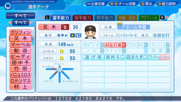 足はそこまで早いわけではないが遅くもなく肩は強い方である。