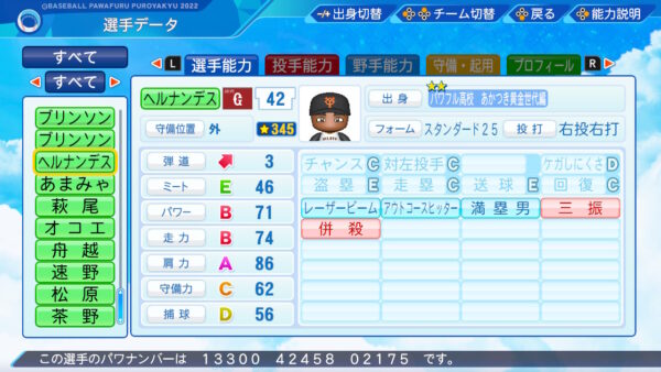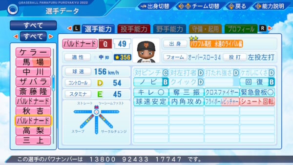球速:154キロにしたかったですが経験点が足りませんでした・・・代わりにノビを上げてます。