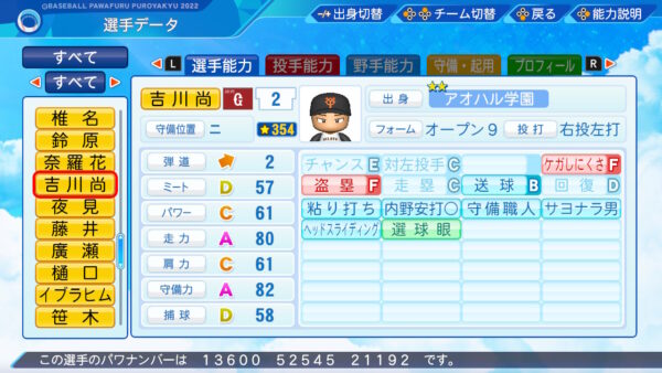 流し打ち:今シーズン逆方向へのホームランは0なので広角打法は削除。しかし逆方向へのヒットは24本と多いので流し打ちを代わりに付けました。