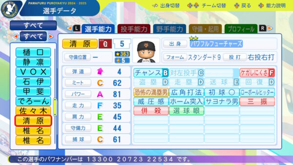 球速安定:デフォでは付いてませんが、この年から平均球速は安定していたので付けています。四球:37.1回で13与四球と高梨のキャリアで最も制球が安定しており、この年は除外していいと思います。