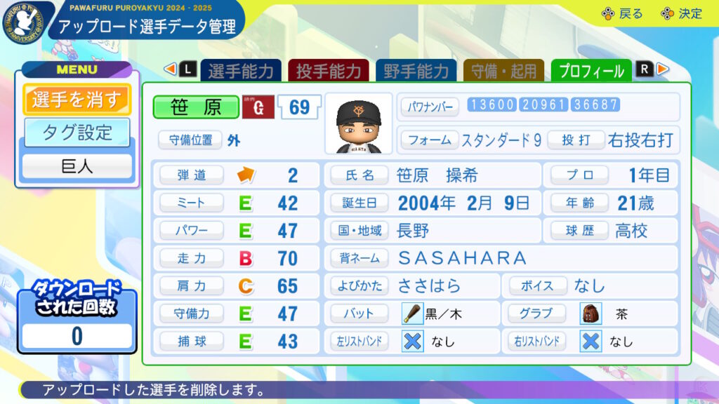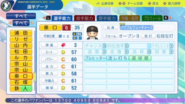 選球眼:昨年の2軍・台湾WLでIsoD0.6以上を記録、今年は2軍で四球>三振とボールの見極めに定評あり。僕は選球眼良いと思いました。(KONAMI)