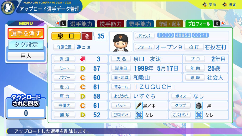 選球眼:笹原がありなら泉口もそうよ対左:対右が.391で対左が.286ですがまだ序盤でいくらでも数値に変化がありそうなので今回はスルーです。