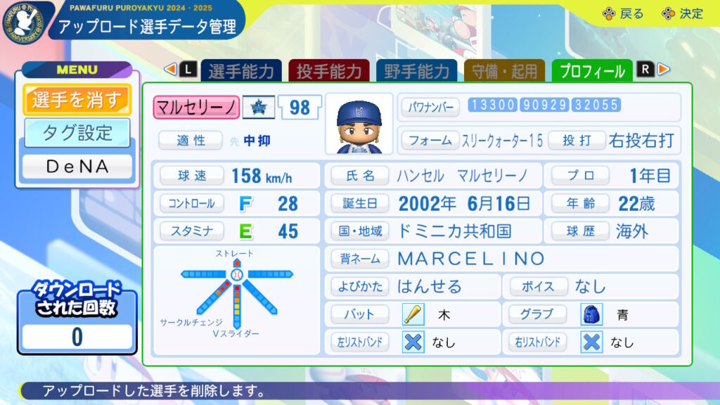 ノビE:2軍のストレート被打率.333、これだけならDのままですが巨人の鈴木大和などホームランを打った事がない選手に長打を打たれる事が時折あるためEにしました。