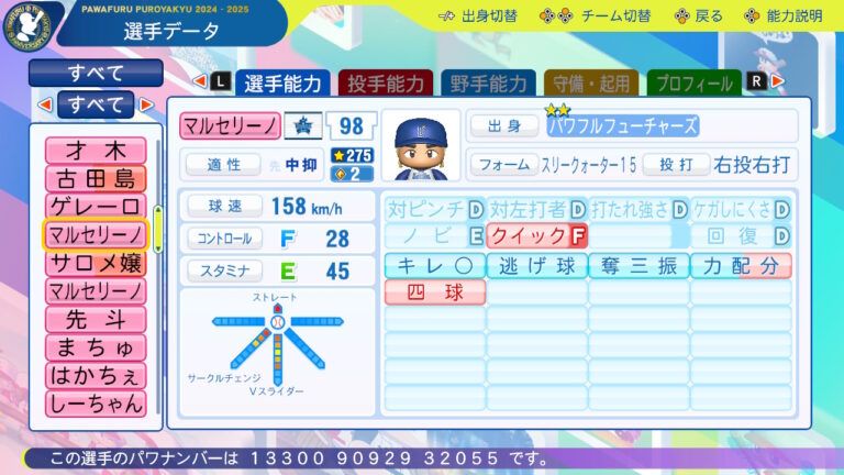 力配分:150キロ以上の平均球速を誇るが時折140キロ台のストレートになることも。このことから球速安定は付けていません。