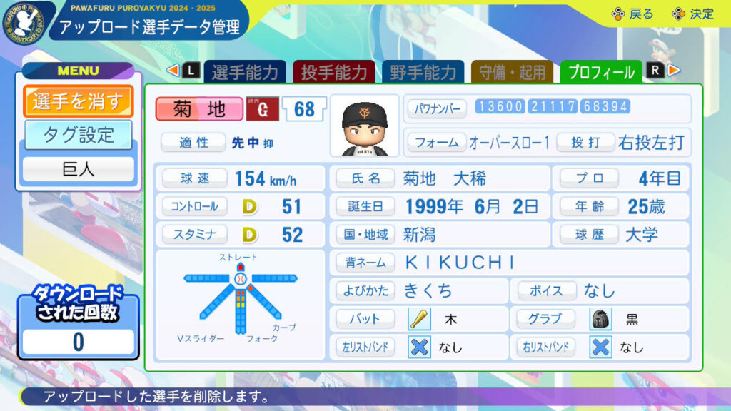 2025年成績(1軍) 1試合 防御率0.00 WHIP0.67(8月2日試合前時点)
