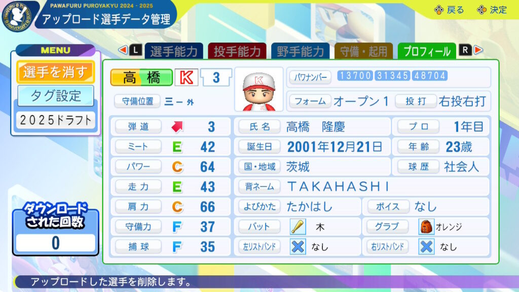 社会人のドラフト候補は高橋選手で終わりかもう1人投手を作成して終わりにするか今日中に判断します。