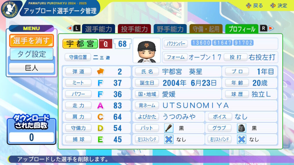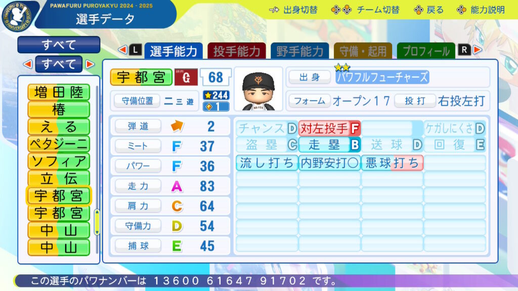 対左F:2025年2軍の対左打率1割台、8月以降は左投手相手に2安打と対応に課題。対ストレート◯:昨年2軍ではストレート打率.344と強かったが、1軍の球速帯を打てるかは現時点で分からないのでナーフしました。