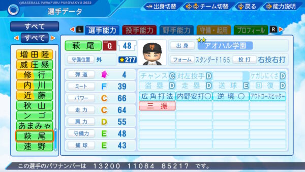 奪三振:リーグ通算36回36奪三振。奪三振の基準は投球回と同じ奪三振数以上ですかね。