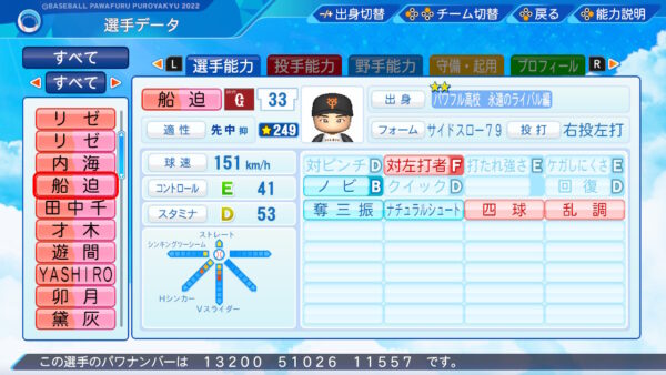 ドラフト5位 船迫大雅 パワナンバー:13200 51026 11557