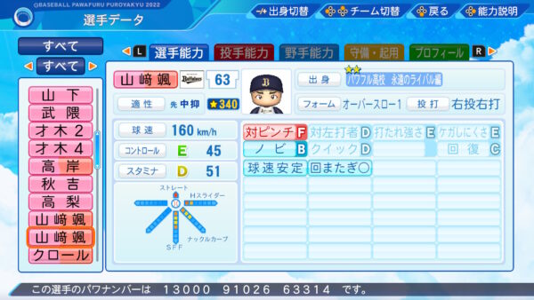 ドラフト1位 松尾汐恩 パワナンバー:13000 70963 55791