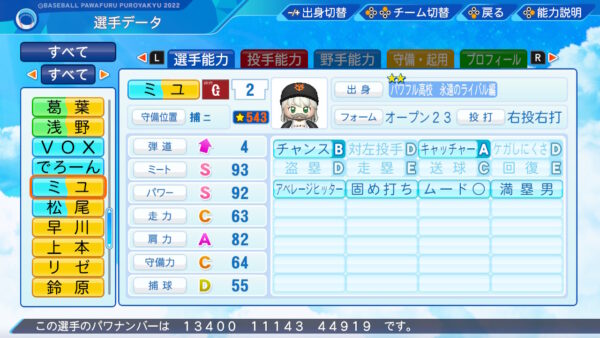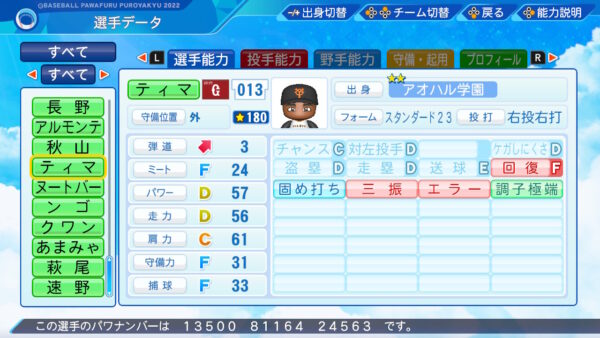 対左F:公式アプデでは一発が付いています。大勢の被打率は対左の方が低いのですが(対右.200 対左.180)被本塁打は左打者に6本打たれています。パワプロの一発は球が一定確率でボールがど真ん中にいく極めて最凶の赤特であり発動する時は問答無用で発動する為正直あまり付けたくありませんでした。