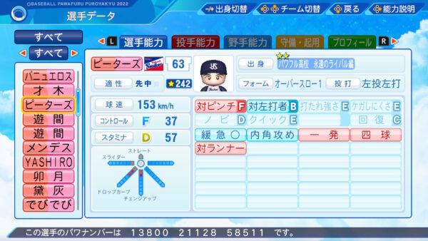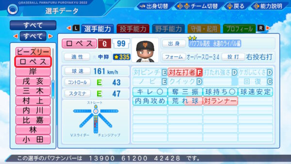 リベンジ:前の打席で抑えられたら次の打席ミート+10という能力で付け所が難しいですが金田との対戦などで長嶋に相応しいと判断したので付けました。
