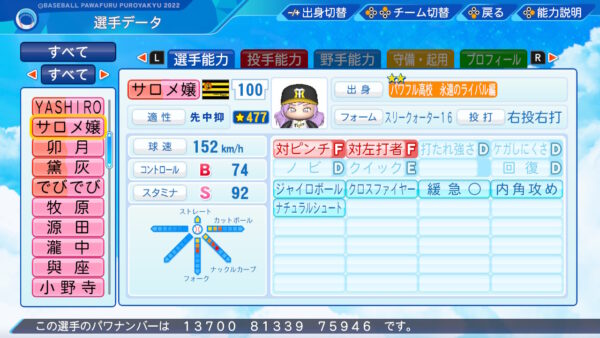 パワプロ2023アップデートきましたね。選手作成第1号は横川投手です。