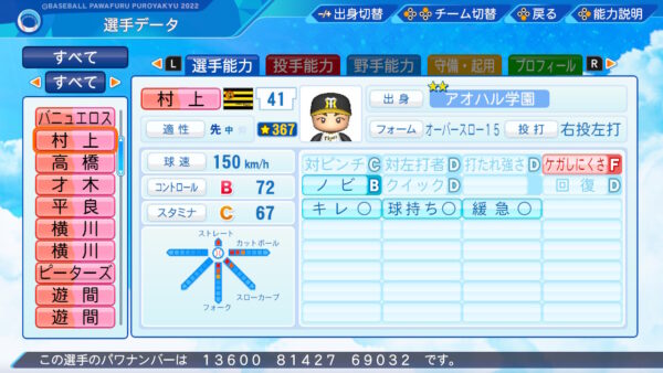 逆境◯:ビハインドの打率今日の試合前まで確か5割以上はあったはず。終盤に打ってる印象があるんで新たに付けています。
